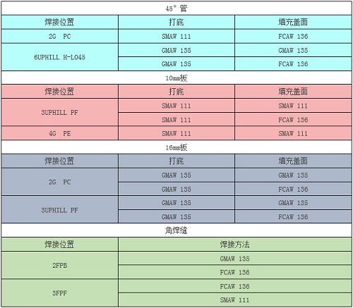 組合件包含管、10mm板、16mm板和角焊縫四個試件。焊接完成后進行外觀檢查、折斷檢驗、射線探傷。四個試件的焊接方法和焊接位置在賽前從下表中抽取確定。