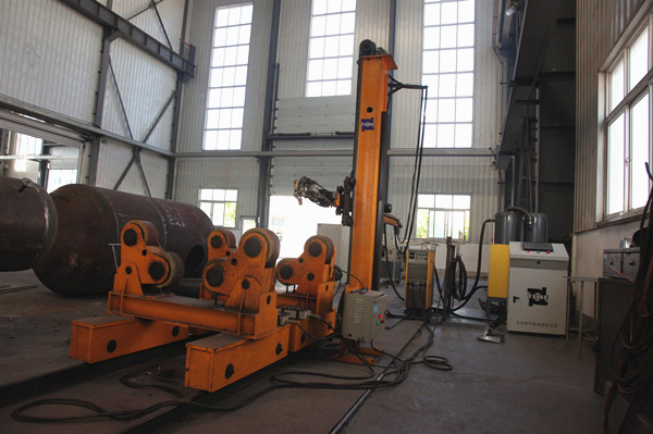 小筒體埋弧焊接專機主要用于筒體內、外縱縫的自動焊接,主要結構由焊接操作機和電動滾輪架組成;操作機主要由立柱(包括提升機構、防墜落保險裝置及配重部件)、橫梁(包括齒條及橫梁驅動部件)、機頭等部件組成。電動滾輪架由一組主動滾輪架、一組從動動滾輪架和底座組成。