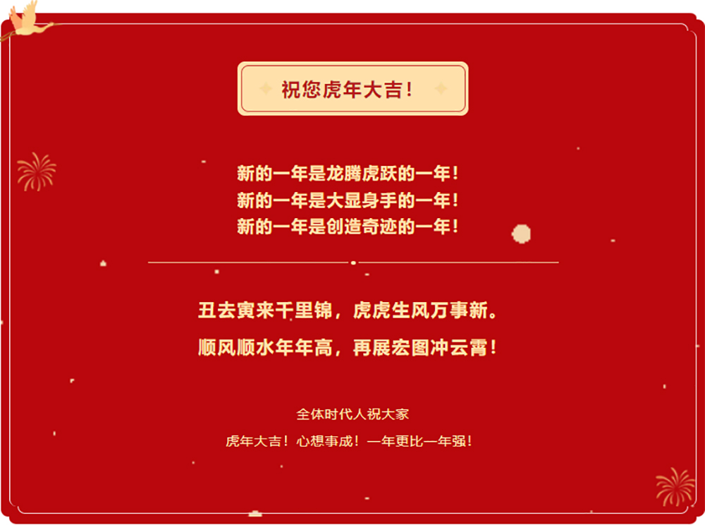 我們懷著熱切的渴望迎接虎虎生風(fēng)的新的一年。新年的發(fā)展藍(lán)圖已經(jīng)鋪開,全體時(shí)代人將躍躍欲試奔赴新的征程!新的戰(zhàn)場!